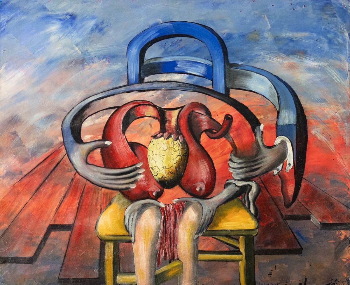 A surrealist scene with a red wooden board in the background and a blue chair. Inside the chair, there is a circular, cracked, yellow object that represents a heart, with two red and blue breasts around it. Blue, red, and yellow colors predominate.